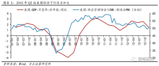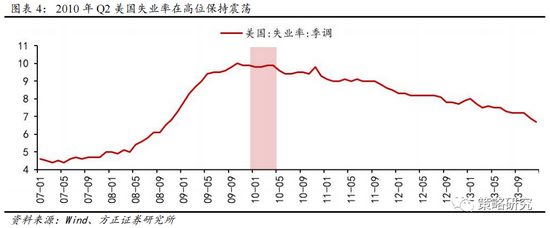 全球经济复苏的证伪是本轮下跌的核心逻辑,欧债危机拉开序幕,美国经济二次探底的趋势逐步显现。在经历2008年的金融危机冲击后,全球主要经济体均采取扩张的财政与货币政策刺激经济复苏,在此背景下美股从2009年3月起重回上行通道,并随着经济的企稳回升,股市由估值向业绩驱动态势明显,经济复苏的成色与持续性成为决定市场走势的核心变量。从4月下旬开始,全球经济的共振复苏逐步证伪,欧洲债务问题持续恶化、中国经济增速开始见顶回落,以及美国经济二次探底的趋势开始显现。欧洲方面,由于希腊政府财政状况持续恶化,4月23日穆迪公司将希腊主权债务评级下调至垃圾级别,27日标普公司同样下调希腊评级至垃圾级,欧洲次贷危机正式拉开序幕。中国方面,2010年Q1中国已经达到一轮经济复苏周期的顶点,随后经济下行压力不断加大。美国方面,在2010年4月美联储正式结束QE1后,市场对流动性收紧后未来经济增长的可持续性存在较大担忧,并且在这一时期包括美国企业盈利在内的各项经济数据出现大幅下滑,失业率长期稳定在9.9%的高位,在此背景下美股市场进入下行通道。随着美联储在公开场合讨论QE2的可行性,7月上旬美股企稳,8月结束了之前的震荡格局,本轮调整正式宣告结束。