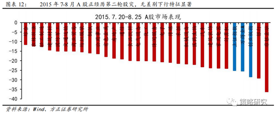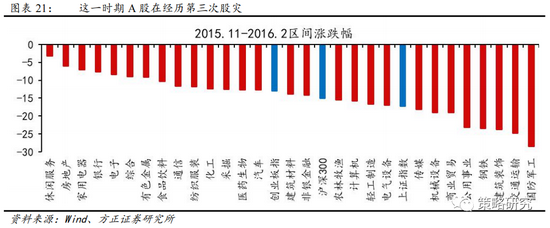 国内来看,A股下跌主要受“811汇改”影响,海外股市的暴跌对A股形成了负反馈,强化了这一时期A股的下行趋势。2015年6月12日上证指数创下5178点的历史第二高点后,大盘开始急转直下,出现两轮断崖式下跌,6月下跌主要由证监会严查场外配资引起,“811汇改”引发的人民币大幅贬值刺激市场再次失速下行。2015年7-8月A股迎来第二轮股灾,指数方面,上证指数、万得全A、创业板指跌幅分别为25.08%/25.45%/28.48%,跌幅均超20%,调整幅度达美国市场的2倍以上。行业方面,28个申万一级行业跌幅均超10%,无差别下跌特征显著。其中农林牧渔、轻工、建材等抗跌性较强,跌幅小于15%。非银、银行跌幅超过大盘水平,其中非银金融跌幅达36.32%。总的来看,这一时期A股市场下跌以内因为主,同时海外市场的暴跌形成负反馈,呈现出共振下行态势。