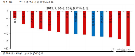 这一时期美股大跌主要受A股市场股灾影响共振下跌,对加息预期的担忧也成为一定诱因。一方面,这一时期A股市场处于见顶后的第二次股灾阶段,尤其是“811汇改”启动后,人民币兑美元中间价瞬间贬值幅度超过3%,市场对中国系统性经济危机爆发概率的上升产生预期,引发了资金对股票的疯狂抛售。人民币汇率的大幅波动引起了全球股市的明显回调,成为这一时期美股市场大幅下跌的主因。另一方面,随着美国经济进一步复苏,失业率持续走低,美国为应对金融危机而实施7年之久的超宽松货币政策可能面临尾声,美联储在2月、6月多次阐述加息可能,加息预期不断走强同样成为这一时期美股市场下跌另一诱因。