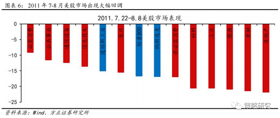 2011年7月至8月美股出现一个月的回调,市场整体下跌幅度超过15%。从美股三大股指表现来看,2011年7月至8月纳斯达克指数下跌16.80%,回调幅度最大,同期标普500、道琼斯工业指数分别下跌16.70%及15.05%。从行业表现来看,本轮回调期间11个标普500行业收益均为负,其中必需消费、公共事业和通信设备呈现相对抗跌属性,跌幅分别为9.09%、11.48%及12.40%,同期顺周期风格的地产、金融和能源板块领跌,下跌幅度分别为21.80%、21.38%及20.85%。