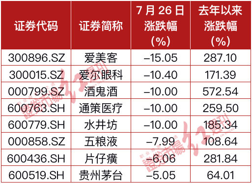 医药生物行业跌幅居前的则主要是前期受市场追捧的个股,如爱美客收跌15.05%,跌幅最大,爱尔眼科(10.40%)紧随其后。此外,通策医疗等直接跌停,片仔癀盘中跌停,接近尾盘打开跌停板。(见附表)