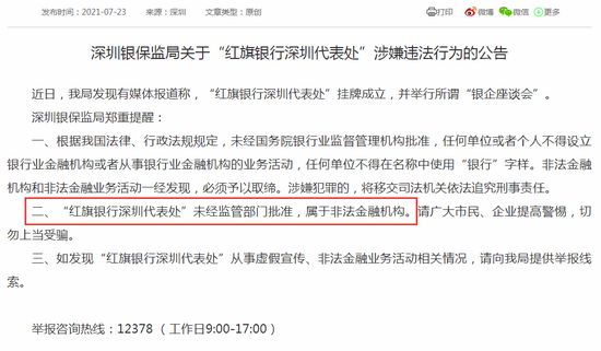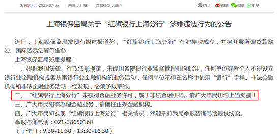 同时,中国证券报记者还拨打了一位工作人员的电话,对于“红旗银行”的相关情况,对方表示不清楚,具体情况和采访要求还要与老板沟通。但截至中国证券报记者发稿,并未获得回复。