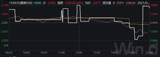 二季报显示易方达中盘ETF的规模在2亿元左右,景顺500ETF规模在1亿元附近,两只产品都随同中融500ETF从13:57分开始,场内交易价格开始异动,并在收盘前30分钟内“上蹿下跳”。