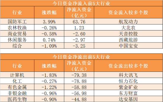 【5日资金线路图】两市净流出418亿元!资金关注军工股,3机构抛售长春高新