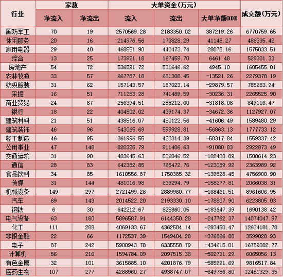 从资金层面看,市场呈大单资金净流出态势,DDE大单净额卖出达406.52亿元。行业方面,有5类申万一级行业大单资金净流入,其中,国防军工(387219.26万元)、休闲服务(41148.27万元)、家用电器(28078.16万元)居前三位。