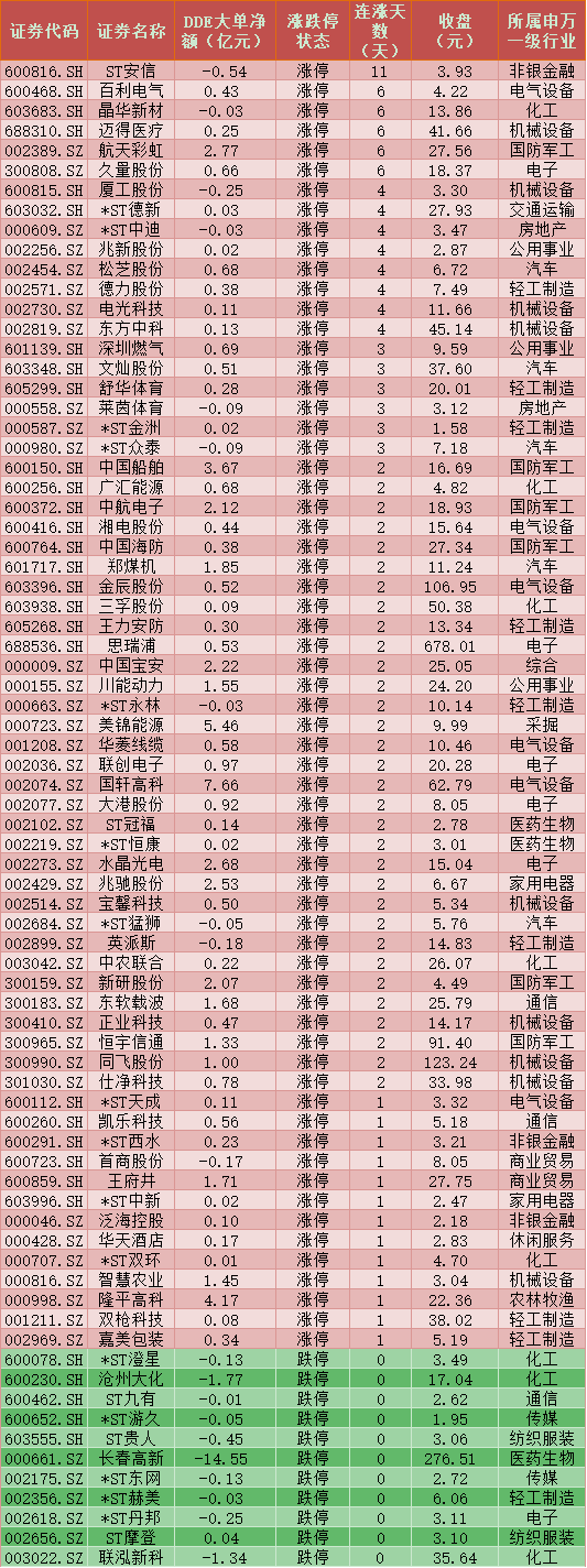 以下是《证券日报》记者对大单资金、涨跌停、两融等主要市场数据进行的梳理,供投资者参考。