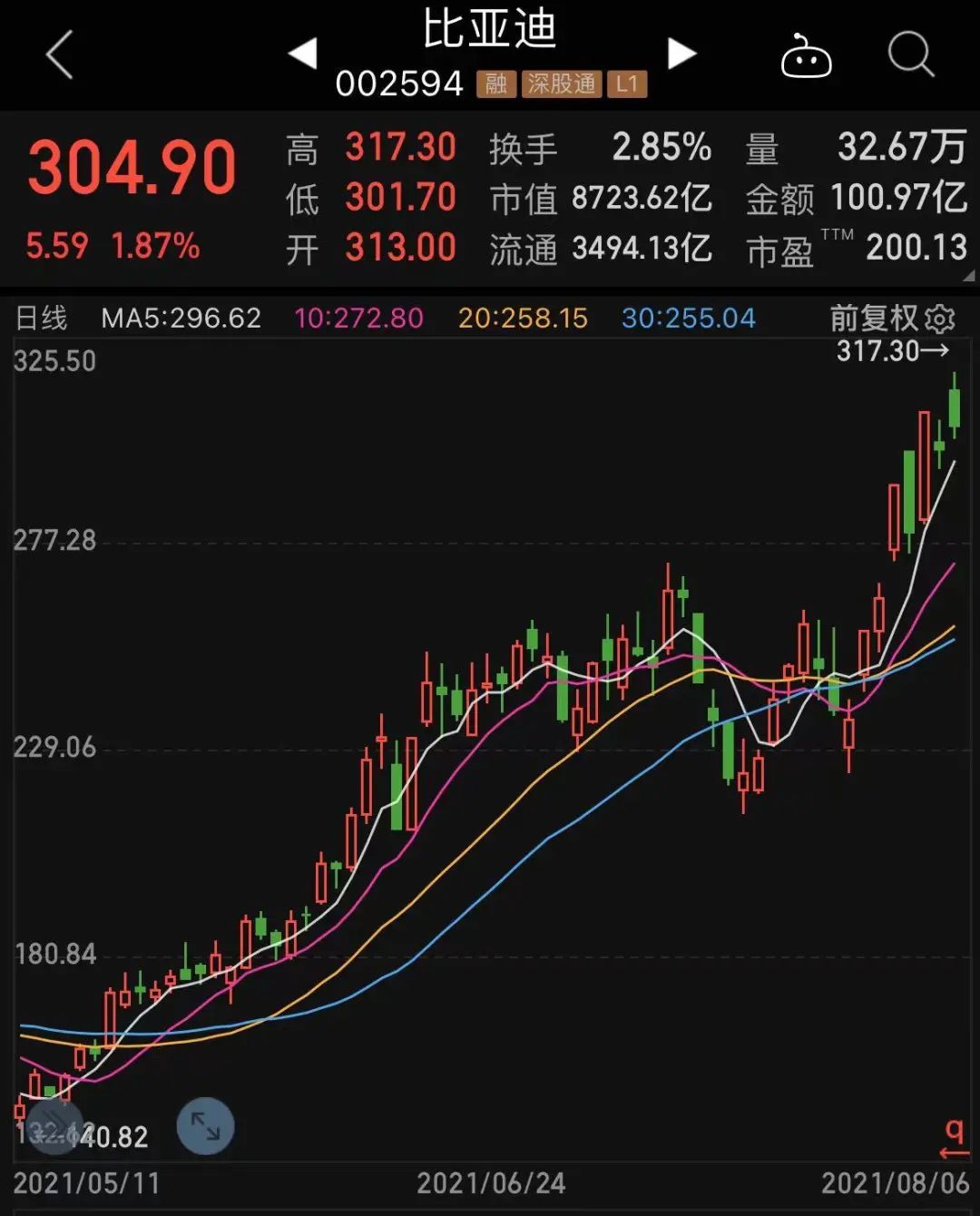 比亚迪今日盘中再创历史新高,最高涨6.01%,市值一度突破9000亿元,截至收盘报涨1.87,最新市值8723.62亿元,年初至今累计上涨57%。值得注意的是,近5日共有55.77亿主力资金净流入比亚迪,今日呈现净流出状态,少量净流出0.19亿元,北上资金已连续三日减仓比亚迪。