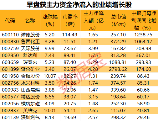 统计显示,早盘主力资金净流入超过1亿元的个股中,13股已公布2021年上半年报告。与之前的业绩预告对比,天际股份、紫金矿业净利润增幅略超此前公布的业绩预告上限,也就是说业绩超乎预期,诺德股份、鲁西化工、科达利同比增幅接近此前公布的业绩预告上限。