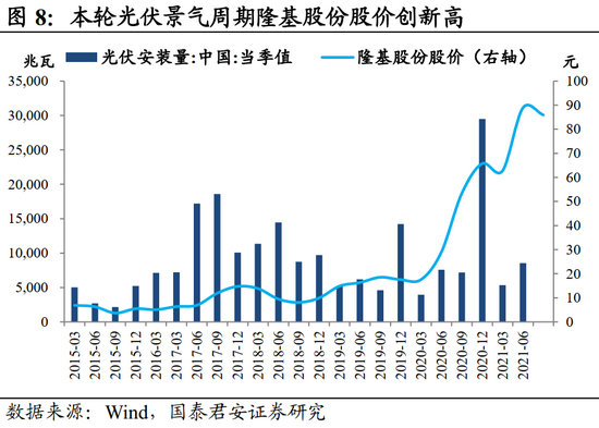 2018年的531新政冲击下,隆基的股价也经历了腰斩。但政策层面的短期扰动并不会扭转隆基的长期发展势头,公司股价很快便拐头向上,并在2020年来这一波景气周期中屡创新高。