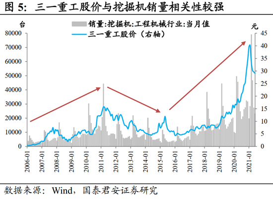 2021年3月我国挖掘机销量7.9万台,同比增长60%;4月销量4.7万台,同比增速仅为3%;5月和6月销量分别为2.7万台和2.3万台,同比增速分别为-14%和-6%,转为同比负增长。敏锐的资金早早嗅到了行业的景气下行,三一自今年2月以来股价一直表现疲弱。
