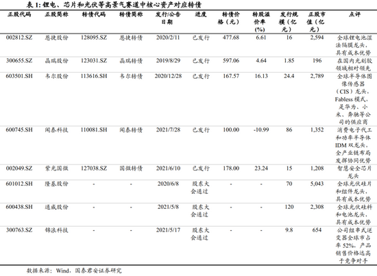 我们认为在不能形成景气转向的预期之前,这些公司的股价短期内仍有继续冲高的趋势。但当前筹码结构趋于集中,股价显然已提前透支了部分业绩增长预期,股价高位波动放大难免,此时追高的短期回撤风险较大。中长期来看,我们建议增持具有技术壁垒、成本优势等核心竞争力的龙头企业对应转债,如恩捷转债、晶瑞转债、韦尔转债、闻泰转债和国微转债,以及有转债预案的隆基股份、通威股份和锦浪科技。