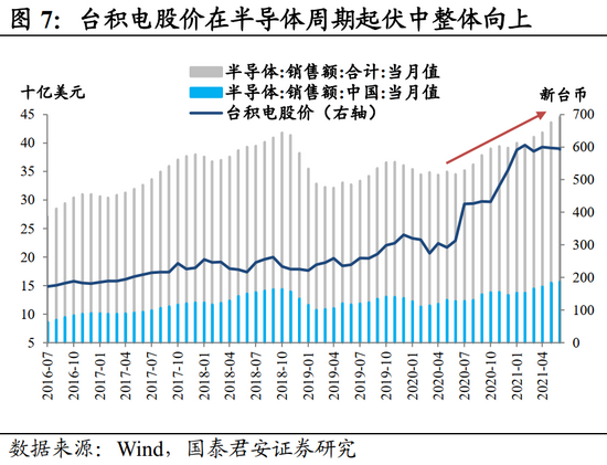 中国是全球最大的半导体市场,我国半导体销售额在全球的占比由2014年的27.3%提升到2020年的34.4%。2019年以来中美贸易摩擦影响下,半导体材料、设备和设计软件等环节成为亟待解决的“卡脖子”问题,2020年以来国家陆续出台政策对产业链予以扶持,国产替代逻辑使得本轮国内半导体周期景气上行阶段被拉长。