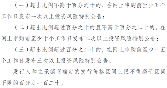 IPO日报初步对比发现,比如此前特别规定中的“(一)超出比例不高于百分之十的,在网上申购前至少五个工作日发布一次以上投资风险特别公告;(二)超出比例超过百分之十的且不高于百分之二十的,在网上申购前至少十个工作日发布二次以上投资风险特别公告;(三)超出比例超过百分之二十的,在网上申购前至少十五个工作日发布三次以上投资风险特别公告。发行人和主承销商确定的发行价格区间上限不得高于区间下限的百分之一百二十。”等内容已被删去。