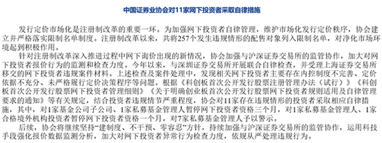 根据《科创板首次公开发行股票注册管理办法(试行)》《科创板首次公开发行股票网下投资者管理细则》《关于明确创业板首次公开发行股票网下投资者规则适用及自律管理要求的通知》等有关规定,结合投资者违规情节严重程度,中国证券业协会对11家存在违规情形的投资者采取相应自律措施。其中,对1家基金公司子公司、1家私募基金管理人暂停网下投资者资格三个月,对1家私募基金管理人、1家合格境外机构投资者暂停网下投资者资格一个月,对7家私募基金管理人予以警示。