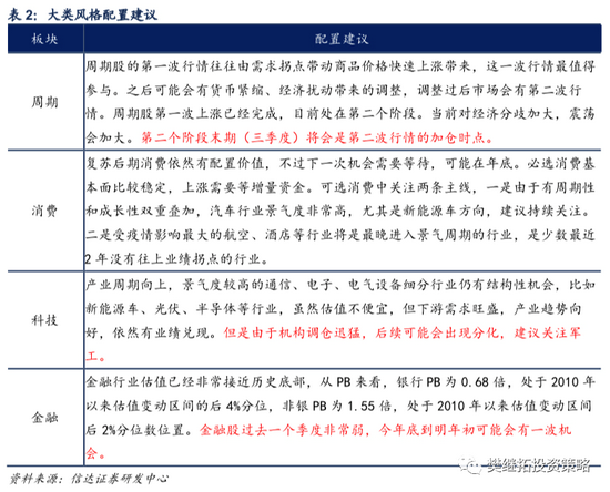 行业配置建议:3月以来的市场风格偏向小盘股,相比2019-2020年,发生了很大的变化,按照历史经验,如果是牛市过程中的风格偏移,则最长不超过半年,未来1-2个月,建议投资者配置上更均衡。成长股中建议重点关注军工。上游周期股还有一波持续半年的机会,重点关注种业、煤炭、有色、石油石化。周期股的业绩兑现还不充分,部分投资者对经济可能会进入下行趋势的判断过度悲观,由悲观预期带来的预期差可能会构成周期股第二次买点。这一买点类似2010年中、2017年6月。