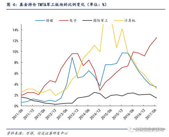 第二个阶段和第一个阶段相比,成长股内部领涨的板块和基金重仓的板块也有很大的变化。从基金持仓来看,2012年公募基金最先增仓电子,2013年上半年快速增仓传媒,2013年下半年开始调仓到计算机,2014年又开始增配军工。