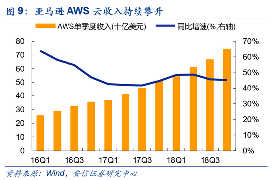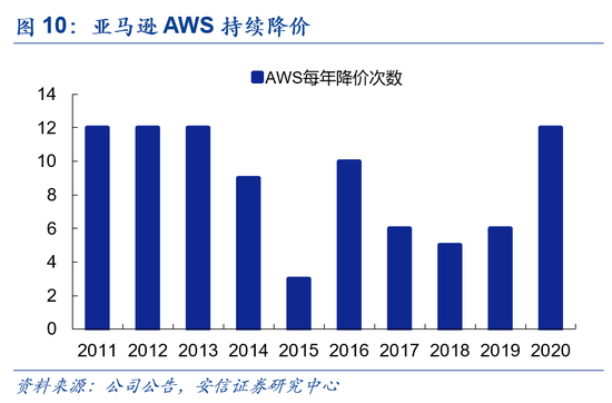 云计算领域白热化竞争,龙头企业凭技术及成本优势加强壁垒,抢占市场。亚马逊在云计算领域具先发优势,早期在市场占有绝对领先的份额。但随着微软、IBM等科技公司的入局,行业竞争格局愈发严峻。对于企业自身来说,云计算服务成本呈递减规律,市场份额显得尤为重要。亚马逊加速研发节奏提升技术壁垒、实现产品迭代升级,不断降低服务价格,稳定市场份额。并且,除了提供基础存储和计算服务外,亚马逊还提供分析、电子邮件、搜索和工作流等其他的功能,以提升用户转化付费率。2011年到2020年,亚马逊云(AWS)共降价87次,平均每年8次以上, 2018年其年报显示,AWS利润同比上涨68.5%,利润率由2016年25.4%增至28.4%。这种价格和技术优势为亚马逊带来利润的同时,也推高了其股价表现。2015年至2018年,亚马逊股价高达涨幅383.4%。