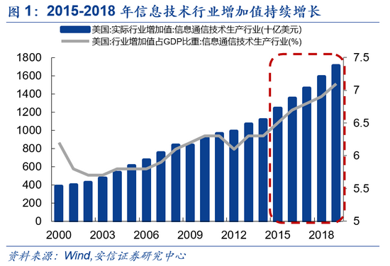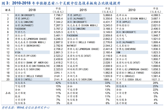 在8月初外发的报告《深度复盘之美国2015-2018年加息周期》一文中,通过复盘美国2015-2018年加息周期,我们发现,2015年至2018年美国科技成长股在小幅缓慢加息背景下,整体凭借盈利高增长股价表现亮眼,受经济货币政策的影响较小。 在人工智能等新兴技术及产业趋势的催化下,2015-2018年通信技术生产行业增加值占GDP比重连续四年增长,由6.5%增长至6.9%;2015年至2018年三季度,科技成长占比较高的纳斯达克指数累计上涨75.3%,远超标普500、道指56.7%、57.9%的上涨幅度。 从具体板块表现来看,互联网和计算机板块表现最为亮眼,区间涨幅分别达113.1%和72.3%。 而从2010年到2018年,美国全部股票市值占比前二十大公司中信息技术行业市值占比更是从25%增长至42%,截至2018年底,市值排名前五大(微软、苹果、亚马逊、谷歌、FACEBOOK)均为科技公司。