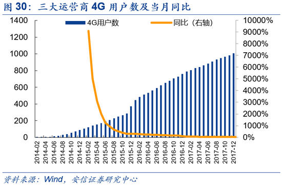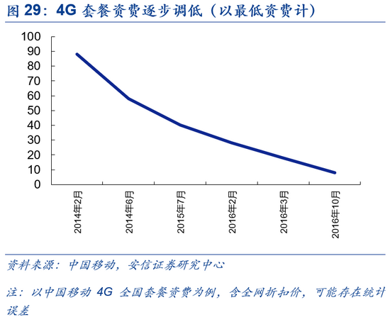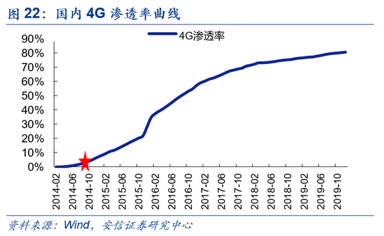 4G的快速渗透亦很大程度上受益于性价比的提升。自2014年中国移动推出4G套餐业务后,我国居民用户正式开启4G时代,用户数缓慢增加,2014年5月达约811万户。2014年6月,中国移动宣布推出新4G套餐,最低资费由原先的88元下调至58元,相比先前4G使用的性价比大幅增加。套餐资费的下降催化了4G用户增长的大爆发,2014年11月,我国4G用户数达7123万,相较同年5月提升逾778%,正式进入成长快车道。之后伴随着4G套餐资费的继续下降, 4G普及率亦呈现进一步加速的态势,至2015年12月,我国4G渗透率已达28.3%,较2014年同期增长405.54%。