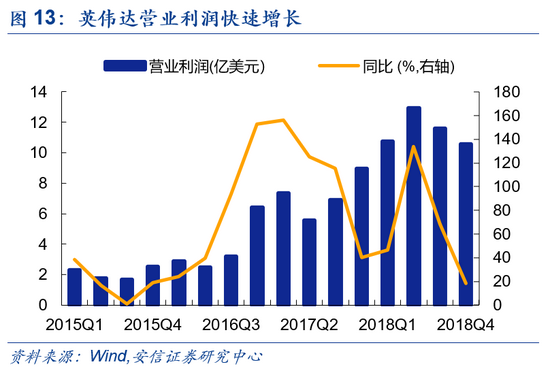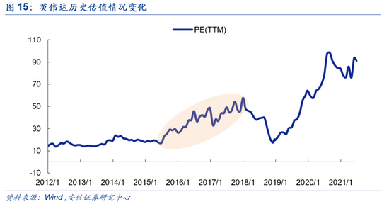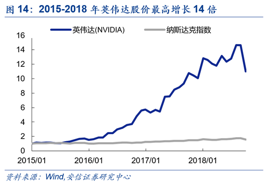 市场表现来看,业绩高增推动股价暴涨。由于业绩持续超预期,2015-2018年英伟达股价涨幅达587.93%,远超纳指表现;产业的高成长性和不断超预期的业绩表现推动其估值大幅抬升,从2015年1月17.9的水平升至2018年的57.7,一再突破此前的估值上限。