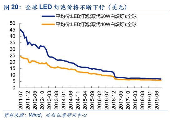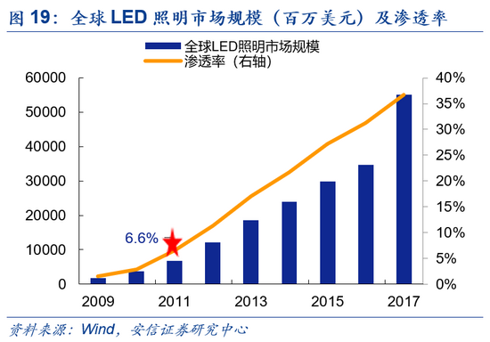 ?LED:90年代后期,白光LED由蓝光LED管芯加黄光YAG荧光粉这一技术路径下得以实现;2001年,科学家又发现由UV LED激发三基色荧光粉亦可得到白光LED。照明所需的白光LED自此逐步开始发展,但囿于产品价格昂贵,普及度尚低。2008年,日本牛尾光源推出LED灯丝灯,虽已实现量产,但彼时高档酒店、高档住宅等仍为主要消费力量。2011年,随着技术进步,LED照明灯泡价格大幅下降,7月当月可替代60W/40W白炽灯的灯泡价格环比分别下降6%/2%,直至11年末,其价格相对7月再分别下降25.4%/8.6%。价格的下降很大程度上推动了LED照明的普及,同年全球LED照明渗透率达6.6%。伴随着LED照明价格继续快速下降,其由商用逐步渗透入民用领域,全球普及率加速提升,渗透率快速上行,至17年末,全球LED照明渗透率已达36.7%。