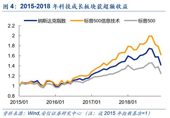 回顾美国2015-2018年科技成长行板块的表现,我们发现: