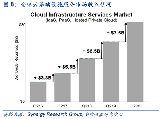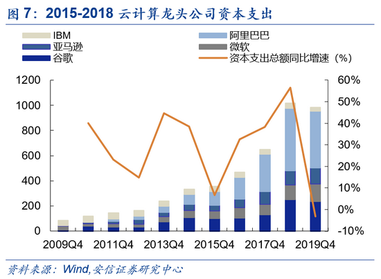 2015-2018年期间,龙头公司加大资本投入,支持云计算业务快速扩张。2015-2018年云计算高速发展,龙头企业投入大量资本,加大基础设施方面如服务器、网络设备支出,支持云计算业务快速扩张。前五大云计算公司资本支出总额由354.4亿美元增加至1017亿美元,四年复合增速30.2%。期间全球云计算市场规模增长中枢保持在10%-20%的高速增长区间。亚马逊AWS作为行业龙头,2016年云计算业务收入就超过百亿美元大关(122.19亿美元)。
