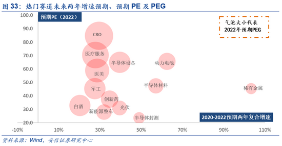 而从赛道比较的角度看,当前新能源车产业链的估值水平也并未极端演绎。通过比较热门赛道当前2022年的预期PEG可以发现,新能源车产业链的PEG水平在热门赛道中处于合理位置,动力电池、整车及上游稀有金属板块的2022年预期PEG均小于1(以具有业绩预期的个股为基础统计计算得出,不包含没有业绩预期的个股)。也就是说,当前新能源车赛道的静态估值水平虽高,但赛道的成长性也较为确定,若考虑其未来两年的增速预期,则当前估值水平尚未极端演绎。