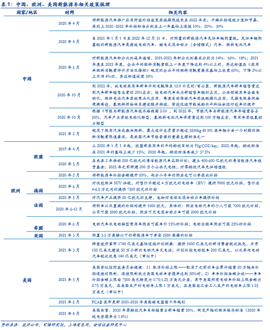 其次则是海内外政策支持下,全球电动化趋势进一步加速,在一定程度上催化了行业产量数据不断超预期。8月5日,白宫发表声明,设定了2030年电动车占新车销量比例达到50%的目标,并加快充电基础设施建设的投资,强化全球汽车电动化的趋势;国内方面,根据《新能源汽车产业发展规划2021-2035》,到2025年,新能源汽车销量需达到汽车总销量的20%;欧盟自去年以来各类促进新能源车发展的政策便不断加码,如建立400-600亿欧元新能源汽车投资基金,加速投资零排放产业链,并在2025年之前新建200万的公共充电桩等。