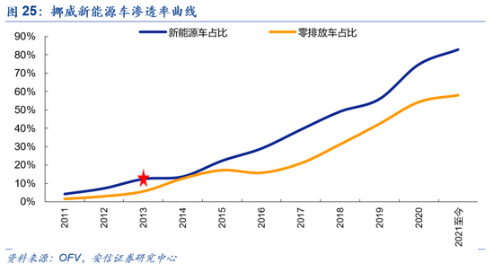 反观当下,伴随着技术发展带来零部件成本的降低,以及续航等问题的陆续解决,我国新能源车产业的发展已从依赖财政补贴等政策激励走向政策需求双驱动阶段。根据中汽协最新数据,2021年6月,国内新能源车产量达到24.8万辆,环比增长14.3%、同比增长134.9%,销量环比增长17.6%、同比增长139.3%,再超市场预期,环比连续三个月加速。渗透率方面,2020年,国内新能源车渗透率达到5.8%的水平;2021年4月,零售端渗透率触及10%的水平;6月单月值达12.7%,同比增长8.2Pcts,环比上涨2.5Pcts。类比挪威的新能源车发展路径,产业在渗透率达到5-10%的水平后开启加速渗透阶段,国内新能源车产业链也正迎来加速发展的黄金时期,将踏入S曲线的陡峭阶段。