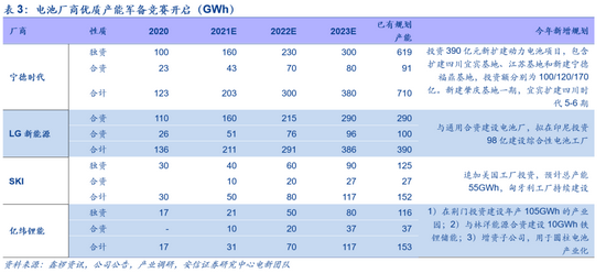 受下游需求拉动叠加海外市场的加速发展,不仅是下游整车厂,我国新能源车产业链,尤其是最具全球竞争力的动力电池环节,预计在今明两年仍将持续维持较高的景气表现。除了下游需求旺盛带动的装机量增加逻辑外,电池厂商亦存在扩大产能、加速抢占市场份额的自身成长逻辑。安信电新团队的研究表明,全球动力电池行业的准入门槛和壁垒高,主要体现在前期资金投入大(单GWh固定资产投入2-3亿元)、优质客户论证周期长(海外客户需要2-3年以上)、前期研发投入大、技术进步带来的产品迭代速度快。目前行业格局为寡头垄断,集中度高。从全球装机量来看,2021年初至今,全球动力电池装机前三仍由宁德时代、LG新能源和松下占据,份额分别为32%、21%和15%(宁德时代有所份额较去年同期上升,LG新能源和松下则有所下滑)前三名占据68%的全球份额,集中度进一步提升。动力电池的竞争,是围绕成本、客户和产能规模的竞争,随着优质的动力电池厂商全球化供应能力的增强,对于以供应链能力为基础的优质电池产能的要求越来越高,在此基础上,动力电池厂商纷纷开启优质产能的军备竞赛,加速扩产,以形成规模和客户配套双重优势,其中预计宁德时代、LG新能源今年年底产能规模(含合资)将超200GWh,在此基础上,包括两巨头在内,SKI、亿纬锂能等厂商纷纷加速产能扩产,目前宁德时代和LG新能源已有规模产能分别达700/400GWh,而SKI和亿纬锂能已规划产能也均超过150GWh。目前动力电池的产能军备竞赛业已开启,随着规模扩张,具备优质产能的全球供应商将更具优势,强者恒强。