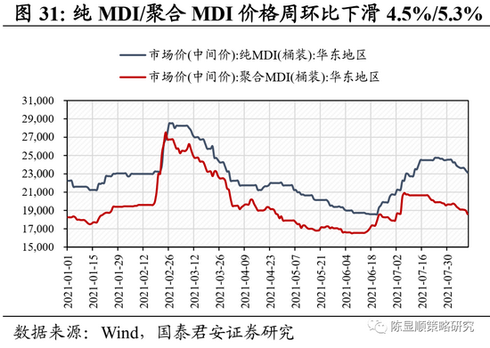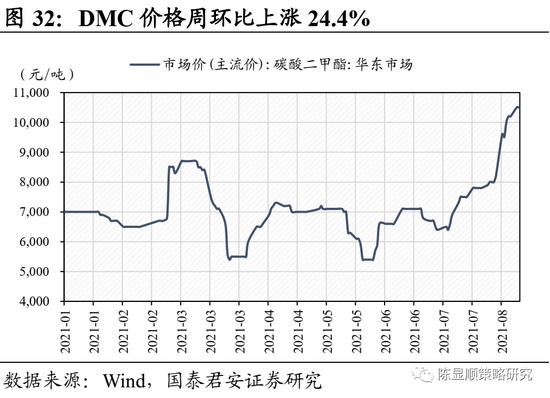 化工:供给趋紧推动DMC价格暴涨,MDI景气维持。截止8月6日,工业级DMC价格报收10200元/吨,周环比大幅上涨24.4%。电池级DMC价格报收11800元/吨,环比上涨2.6%。DMC涨价主因厂家装置停车或低负运行带来的供给偏紧,上周DMC行业开工率大幅下探14.02%,当前下游电解液需求旺盛,供需趋紧下DMC价格有望持续上涨。截止8月10日,纯MDI/聚合MDI价格分别报收23150元/吨、18600元/吨,周环比下滑4.5%/5.3%,主因疫情反复打击下游采购积极性。当前MDI仍处于传统检修期,随着下游旺季到来,MDI价格有望继续上涨。