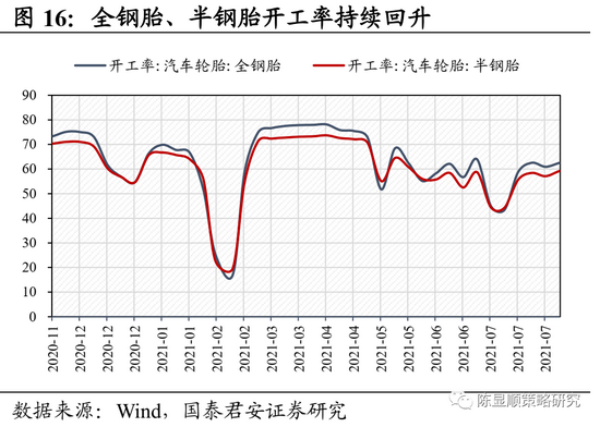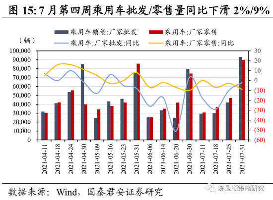 汽车产销:缺芯问题见改善信号,渠道补库存动能开始释放。乘联会汽车销量数据显示,7月第四周乘用车批发/零售销量分别为93197辆和89810辆,同比下滑2%和9%,批发销量的明显改善预示着行业补库存动力开始释放。近两周缺芯问题在生产和渠道端均出现边际改善的信号:生产端,马来西亚等国家恢复汽车芯片生产,预计在8月中下旬芯片供应会逐步改善;渠道端,市场监管总局出拳整治汽车芯片代理商炒货,此举有利于降低车企和零部件的采购成本,加速汽车芯片投放市场。缺芯问题缓解背景下,汽车行业景气度有望持续抬升。