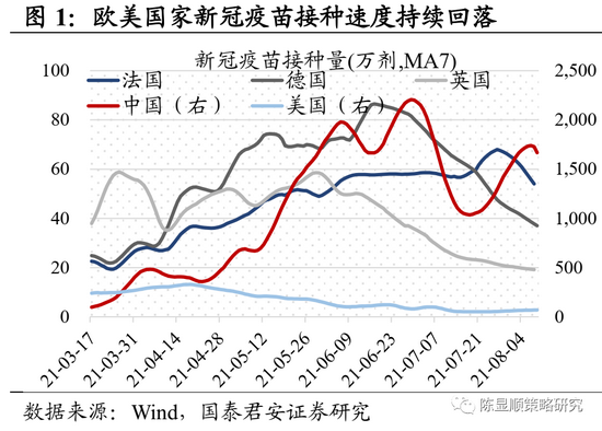 中国德尔塔毒株疫苗研发取得新进展。8月5日,科兴董事长尹卫东在新冠疫苗合作国际论坛上表示,科兴已经完成了克尔来福第三针加强免疫的研究,接种第三针仍然像接种第一针和第二针一样安全,同时中和抗体水平可以在一周内快速地大幅度提升,从而加强对变异病毒的保护效果。加强免疫后的真实世界研究已经在土耳其、智利等国展开,很快也将获得结果。近期疫情冲击下中国新冠疫苗接种速度维持高位,但欧美国家疫苗接种速度均有所放缓,截止8月8日,中、法、德、英、美每百人新冠疫苗接种量分别为123.84剂、114.90剂、113.45剂、127.58剂、105.07剂。103.15剂、106.73剂、123.56剂、102.21剂。
