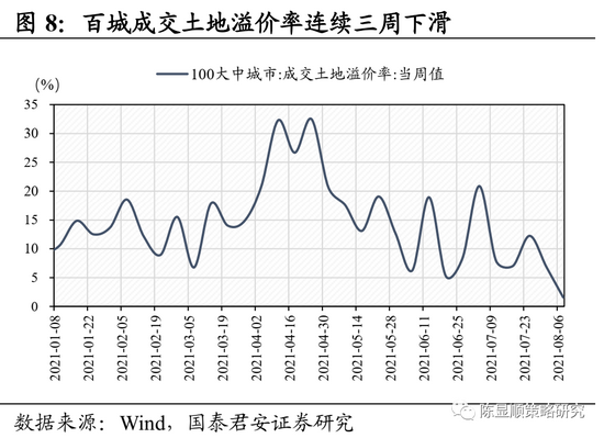 地产:多城集中供地中止或延期,稳地价预期下土地溢价率有望回落。地产销售承压,百城供应与成交土地建面大幅下滑。截止8月8日,一、二、三线重点城市商品房当月成交面积周环比分别下降0.8%、17.5%、47.0%。回顾上半年,22城首轮集中供地总计成交住宅用地(含综合用地)878宗地块,成交用地面积约5037公顷、规划建筑面积1.11亿平方米、土地价款总计1.07万亿元,综合溢价率达15.1%。整体成交楼面均价9591元/平,较2020年成交楼面均价上涨38.3%。部分区域溢价率大幅上涨,首批集中供地效果不及预期,这使得7月中央强调完善稳地价工作机制,自然资源部随即表示研究调整重点城市土拍规则。8月以来,青岛、深圳、天津等宣布中止或延期第二批集中供地,杭州已在第二批集中供地时做出了提高竞拍门槛、降低溢价率上限等调整政策,其他城市有望跟进。重点城市土拍规则调整,叠加中央加强购地企业资格和资金审查,土地市场将明显降温,土地溢价率有望回落。