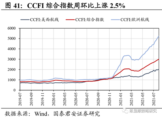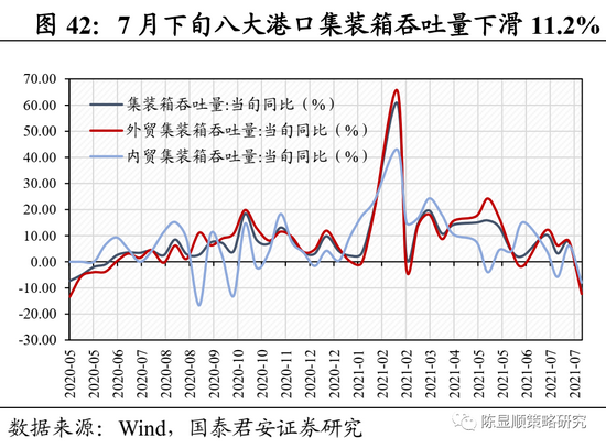 海运:7月下旬八大港口集装箱吞吐量大幅下滑,运价持续上行。7月下旬八大港口集装箱吞吐量同比下滑11.2%,其中外贸同比下滑12.3%,内贸同比下滑8.0%,主因台风烟花致使沿海多地港口临时停产。国外疫情反弹加剧港口拥堵,致使运价持续上升,截止8月6日,CCFI综合指数报收3006.82点,周涨幅2.5%,CCFI美西航线、CCFI欧洲航线周涨幅分别达2.5%、3.2%。