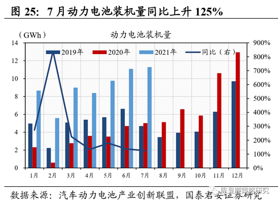 新能源车:7月动力电池装机需求旺盛,美国电动化进程步入快车道。上周美国总统拜登签署行政令,设定2030年电动车渗透率达50%的目标,按当前渗透率测算,未来10年美国新能源车销量复合增速将超过40%,新能源汽车全产业链或将长期受益。7月我国动力电池装车量11.3GWh,同比增长125.0%,环比增长1.7%。其中三元电池共计装车5.5GWh,同比增长67.5%,环比下降8.2%;磷酸铁锂电池共计装车5.8GWh,同比增长235.5%,环比上升13.4%,行业高景气持续。
