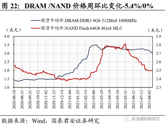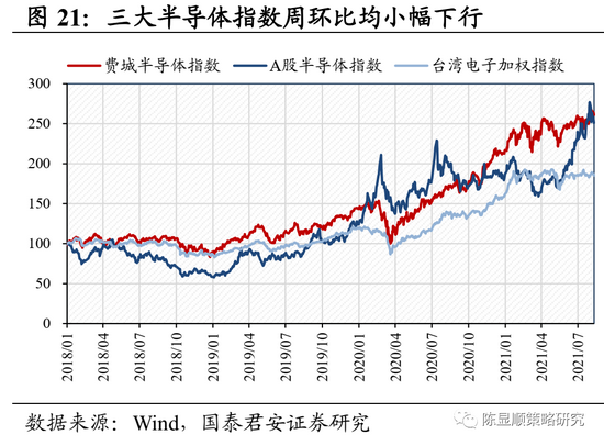 半导体:中芯国际调升业绩指引,北美半导体设备出货额创新高。6月全球半导体销售额445.3亿美元,同比增长29.2%,北美半导体设备出货额36.7亿美元,同比增长58.4%。受益于芯片需求强劲以及天津厂8英寸产能的继续投放,中芯国际业绩表现亮眼,Q2实现营收13.44亿美元,同比增长43.2%,环比增长21.8%。预计行业高景气持续,公司调升业绩指引,全年销售收入成长目标和毛利率目标上调到30%左右。存储方面,截止8月10日,DRAM/NAND现货价格分别报收2.96美元/2.50美元,周环比变动-5.4%/0%,当前市场库存水位偏高跌价的主因,但随着Q3终端产品需求旺季到来,预计存储芯片价格有望重拾涨势。截止8月10日,费城半导体指数、A股半导体指数、台湾电子加权指数周环比下滑1.11%、0.47%、-1.42%。