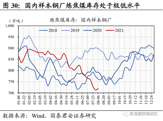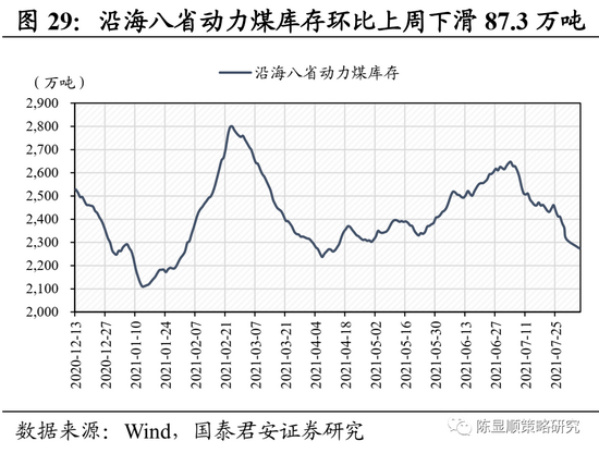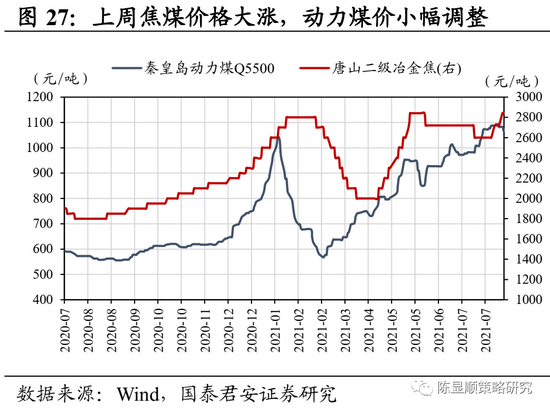 煤炭:露天煤矿复产保供,电厂高日耗低库存支撑煤价维持高位。近期内蒙古38处停产露天煤矿复产,5省15座联合试运转到期煤矿延期,保供政策初见成效,截止8月6日,北方港港口库存1819万吨,周环比上涨9.2%。但受“迎峰度夏”旺季影响,全国用电负荷和日发电量突破历史峰值,沿海八省电厂煤炭库存持续回落,可用天数降至10天左右新低水平,高日耗低库存支撑动力煤价高位震荡,截止8月10日,Q5500秦皇岛动力煤价报收1067.5元/吨,周环比下跌2.3%。近期炼焦煤价格大幅上涨,截止8月10日,唐山二级冶金焦价报收2840元/吨,周环比上涨4.4%,主因部分地区安全环保检查停产,以及动力煤供应偏紧背景下,部分焦煤产能用于动力煤保供致使供给趋紧。当前下游钢厂炼焦煤库存逼近2018年以来的新低水平,预计短期内焦煤价格上行动力仍强。