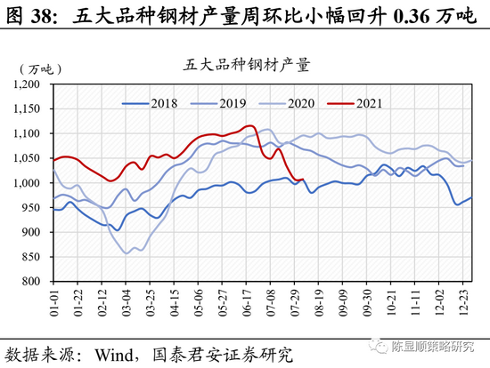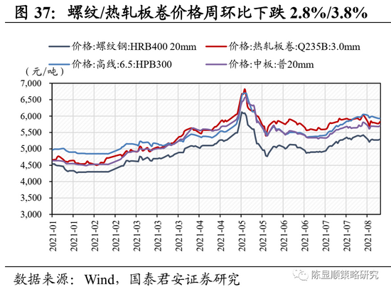 钢铁:限产持续推进,钢价持续高位震荡运行。截止8月6日,螺纹钢、热轧板卷报收5270元/吨、5800元/吨,周环比下跌2.8%/3.8%,主因“纠正运动式减碳”要求及“取消钢铁产品出口退税”政策对市场预期造成扰动。上周五大品种钢材周产量1007.2万吨,周环比小幅回升0.36万吨,限产影响持续。钢材社会库存持续去化,周环比下滑17.1万吨,而钢厂库存在连降四周后转为增加,主因市场预期钢铁未来需求向好,开始自发性主动补库。随着各地疫情逐渐好转且8月份钢铁逐步进入需求旺季,钢铁库存去化的趋势不会改变,供需趋紧背景下钢价将持续高位震荡运行。