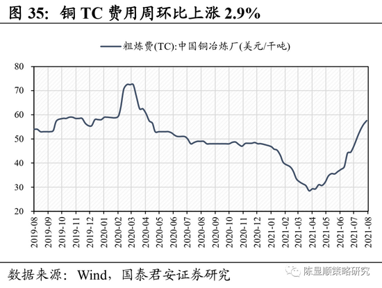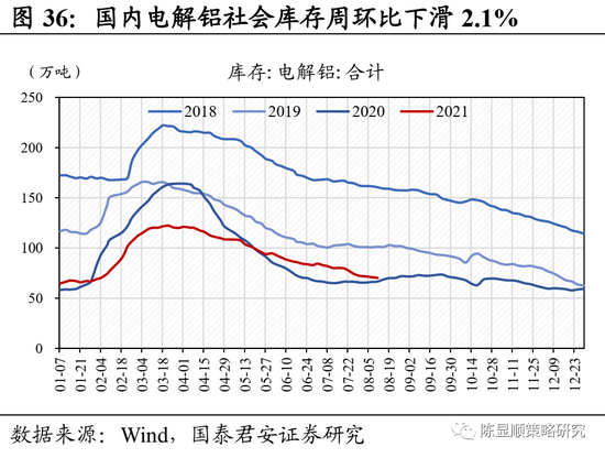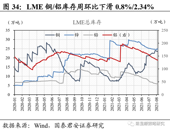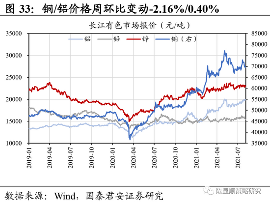 多城集中供地中止或延期,稳地价预期下土地溢价率有望回落。回顾上半年,22城首轮集中供地总计成交住宅用地(含综合用地)878宗地块,成交用地面积约5037公顷、规划建筑面积1.11亿平方米、土地价款总计1.07万亿元,综合溢价率达15.1%。整体成交楼面均价9591元/平,较2020年成交楼面均价上涨38.3%。部分区域溢价率大幅上涨,首批集中供地效果不及预期,使得7月中央强调完善稳地价工作机制,自然资源部随即表示研究调整重点城市土拍规则。8月以来,青岛、深圳、天津等重点城市宣布中止或延期第二批集中供地,杭州已在第二批集中供地时做出了提高竞拍门槛、降低溢价率上限等调整政策,其他城市有望跟进。重点城市土拍规则调整,叠加中央加强购地企业资格和资金审查,重点城市土地市场将明显降温,土地溢价率有望回落。 分布式光伏试点申报踊跃,光伏装机迎来重要增量。6月国家能源局下发县级屋顶分布式光伏开发试点方案,7月能源局反馈各省试点申报踊跃,其中东中部地区上报试点数量相对较多,这与国家在东中部地区大力推广分布式光伏的布局相符。据光伏们报道,当前中东部省份平均每省上报的整县申报规模超过20个,按照平均每个省最终上报20个试点县计算,保守估计目前已经上报的22个省(区)将有超过400个县参与到此次分布式光伏整县推进试点中;按照每个县200MW的规模计算,400个县整县分布式光伏装机规模将超过80GW,预计最终规模或将超过100GW,由于整县推进试点工作不需要国家能源局审批,预计首批试点项目将于未来两年内落地。据CPIA预测,2021~2022年我国新增光伏装机量预计在115-140GW,分布式试点推进将对未来光伏装机提供重要增量。 Taper预期短期压制铜价,供需紧张下铝价有望持续上升。截止8月10日,长江铜、铝报价周环比分别变动-2.16%/0.40%。美国7月非农就业数据大超市场预期,Taper预期下金属铜价格大幅调整。铝由于金融属性较弱,且国内供给偏紧,价格依旧小幅抬升。当前电解铝限电问题仍未得到缓解,云南限产比例上升,内蒙、广西、贵州也开始限产,合计影响185万吨在产产能,占全部产能比例4.3%,前期河南暴雨引发的电解铝停产产能短期也难以恢复。截止8月9日,国内电解铝社会库存70.4万吨,周环比下滑2.1%,当前已处于历史低位,“供给趋紧+库存低位”双重支撑下,铝价有望继续抬升。