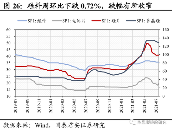 光伏:硅料价格跌幅收窄,分布式光伏试点申报踊跃。6月国家能源局下发县级屋顶分布式光伏开发试点方案,7月能源局反馈各省试点申报踊跃,其中东中部地区上报试点数量相对较多,这与国家在东中部地区大力推广分布式光伏的布局相符。据光伏们报道,当前中东部省份平均每省上报的整县申报规模超过20个,按照平均每个省最终上报20个试点县计算,保守估计目前已经上报的22个省(区)将有超过400个县参与到此次分布式光伏整县推进试点中;按照每个县200MW的规模计算,400个县整县分布式光伏装机规模将超过80GW,预计最终规模或将超过100GW,由于整县推进试点工作不需要国家能源局审批,预计首批试点项目将于未来两年内落地。据CPIA预测,2021~2022年我国新增光伏装机量预计在115-140GW,分布式试点推进将对未来光伏装机提供重要增量。近期一线龙头硅片厂开始逐步恢复采购,硅料价格跌幅收窄。