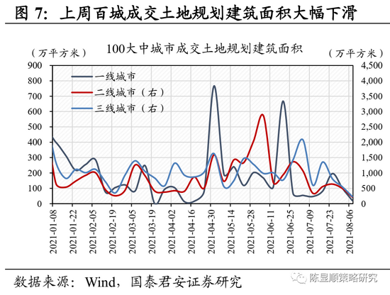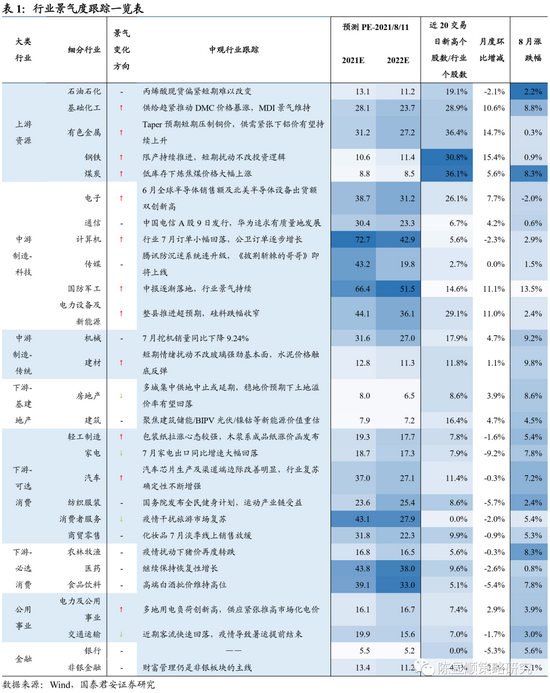 行业聚焦:? 多城集中供地中止或延期,稳地价预期下土地溢价率有望回落。回顾上半年,22城首轮集中供地总计成交住宅用地(含综合用地)878宗地块,成交用地面积约5037公顷、规划建筑面积1.11亿平方米、土地价款总计1.07万亿元,综合溢价率达15.1%。整体成交楼面均价9591元/平,较2020年成交楼面均价上涨38.3%。部分区域溢价率大幅上涨,首批集中供地效果不及预期,使得7月中央强调完善稳地价工作机制,自然资源部随即表示研究调整重点城市土拍规则。8月以来,青岛、深圳、天津等重点城市宣布中止或延期第二批集中供地,杭州已在第二批集中供地时做出了提高竞拍门槛、降低溢价率上限等调整政策,其他城市有望跟进。重点城市土拍规则调整,叠加中央加强购地企业资格和资金审查,重点城市土地市场将明显降温,土地溢价率有望回落。? 分布式光伏试点申报踊跃,光伏装机迎来重要增量。6月国家能源局下发县级屋顶分布式光伏开发试点方案,7月能源局反馈各省试点申报踊跃,其中东中部地区上报试点数量相对较多,这与国家在东中部地区大力推广分布式光伏的布局相符。据光伏们报道,当前中东部省份平均每省上报的整县申报规模超过20个,按照平均每个省最终上报20个试点县计算,保守估计目前已经上报的22个省(区)将有超过400个县参与到此次分布式光伏整县推进试点中;按照每个县200MW的规模计算,400个县整县分布式光伏装机规模将超过80GW,预计最终规模或将超过100GW,由于整县推进试点工作不需要国家能源局审批,预计首批试点项目将于未来两年内落地。据CPIA预测,2021~2022年我国新增光伏装机量预计在115-140GW,分布式试点推进将对未来光伏装机提供重要增量。? Taper预期短期压制铜价,供需紧张下铝价有望持续上升。截止8月10日,长江铜、铝报价周环比分别变动-2.16%/0.40%。美国7月非农就业数据大超市场预期,Taper预期下金属铜价格大幅调整。铝由于金融属性较弱,且国内供给偏紧,价格依旧小幅抬升。当前电解铝限电问题仍未得到缓解,云南限产比例上升,内蒙、广西、贵州也开始限产,合计影响185万吨在产产能,占全部产能比例4.3%,前期河南暴雨引发的电解铝停产产能短期也难以恢复。截止8月9日,国内电解铝社会库存70.4万吨,周环比下滑2.1%,当前已处于历史低位,“供给趋紧+库存低位”双重支撑下,铝价有望继续抬升。? 风险因素:德尔塔病毒蔓延导致疫情波动,下游消费复苏不及预期