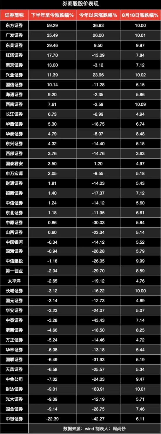 此外,券商股在二级市场的走势分化也十分明显。下半年以来,中银证券的股价跌幅超20%,还有包括国金证券、光大证券在内的19只券商股依旧处于下跌状态。