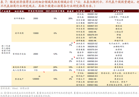 ? 趋势一:老龄人口快速增长及新一代老年人来临背景下的银发经济,对应的细分领域包括老年保健品、老年药、家庭医疗设备、康复医疗服务、养老地产、老年失禁用品等。
