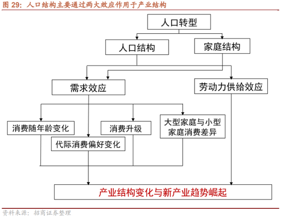 一个国家产业结构的变动通常与该国的消费需求、要素禀赋以及技术进步密切相关,而人口结构又是影响一个国家消费需求、劳动力供给、人力资本积累、技术创新和劳动力生产率的重要因素。人口转型必然会对产业结构产生影响,关注产业结构变化下的新产业趋势对长期投资的方向性把握具有重大意义。总结来看,人口结构主要通过需求效应及劳动力供给效应两条途径影响产业结构。