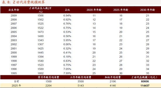 第二种,假设21岁及以后是工作年龄,21岁之前是学习年龄,学习年龄月均消费1500,工作之后月均消费3500,根据各年龄层人数加权计算,2020年Z世代月均消费支出为2200元,当前的Z世代消费市场为6万亿元。假设今后5年人均消费支出以9%速度增长,2026-2030年按照7.5%增长,则2025年Z世代月均消费支出4146元,Z世代消费规模为11.4万亿元,2030年Z世代月均消费支出8383元,整体消费规模为20.4万亿元。