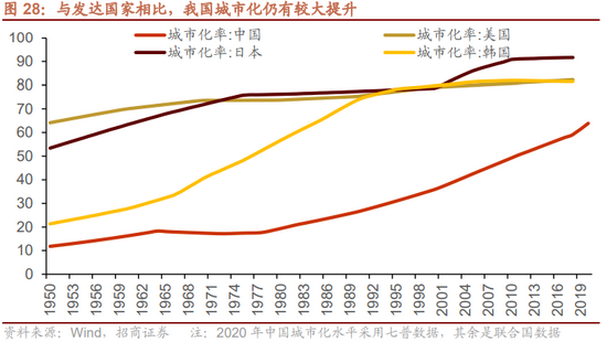 人口大规模流动的背后是城乡、城市之间发展不均衡的问题,未来我国城镇化水平仍有较大提升空间。过去10年,我国城镇化率提高速度较快,七普数据显示,当前我国城镇化水平为63.89%,较2010年提高了14.21%。根据其他发达国家的城市化经验,第一阶段城镇化一般以70%为临界点,城镇化率达到70%以后,提升的速度开始明显放缓。因此,如果仍以过去十年的平均速度发展,我国距离70%的城市化水平还相差5-6年。此后,尽管城市化速度放缓,但是距离美日韩等发达国家80%-90%的城市化水平仍有较大的差距。