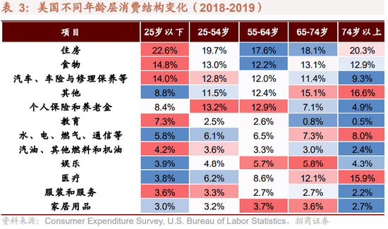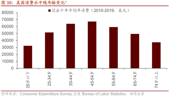 ?人生不同阶段消费需求不同:25岁以下的年轻人住房、食物与衣着等必需消费开支比例最高,此外其教育开支最高。25-44岁人口住房消费、食物、服装等消费仍保持较高水平,教育开支相较此前大幅下降。45-64岁人口必需消费开支比例相对较低,个人保险与养老金、娱乐、家居消费比例上升。65岁以上人口则在医疗方面消费比例大幅提升,住房与食物消费比例略有提升,养老金、汽车、家居等可选消费比例下降。