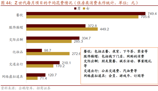 从消费结构来看,当前Z世代在餐饮、住房上的消费相对较高,其余的消费主要集中在交际应酬、化妆品、交通出行以及网络虚拟道具上,可以发现,Z世代在网上虚拟道具上的消费比较突出。